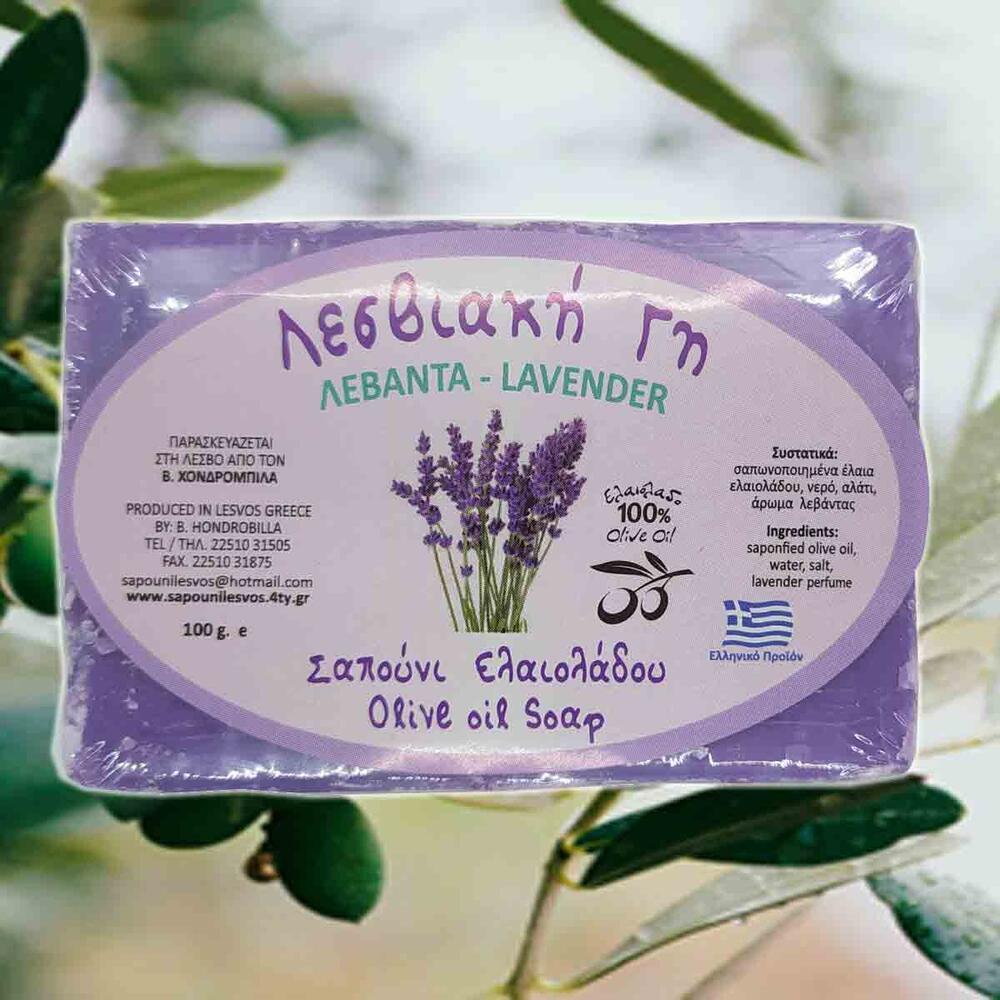Γνήσιο Σαπούνι Ελαιολάδου με άρωμα Λεβάντας από την Μυτιλήνη, Εξαιρετικής Ποιότητας. Αγνά σαπούνια ελαιολάδου από την οικογενειακή Σαπωνοβιομηχανία "Λεσβιακή Γη" στην Μόρια της Λέσβου. Χρησιμοποιούνται μόνο εξαιρετικής ποιότητας πρώτες ύλες, για να διασφαλίζεται η υψηλή ποιότητα των σαπουνιών και να διατηρούνται αναλλοίωτα τα αρώματά τους. Συστατικά: Σαπωνοποιημένα έλαια ελαιολάδου, νερό, αλάτι, άρωμα λεβάντας 100% ΦΥΣΙΚΟ-ΒΙΟΔΙΑΣΠΩΜΕΝΟ ΥΠΟΑΛΛΕΡΓΙΚΟ ΠΡΟΪΟΝ